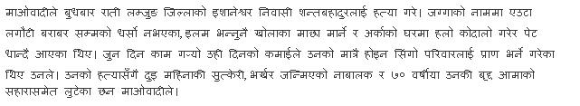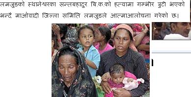 Here is the anohter story. The kill the peron for stealing the chicken. After his death he was left by a prengant wife and kid, and mother. They had only him to look after. I dont know what will happen to his poor family now. If punishment of stealing is death then i guess there would have been no maoist left in nepal. .