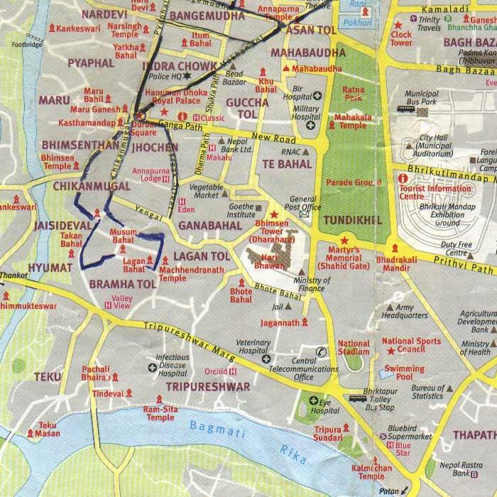 the map is heplful while we attempt to visualize the location of the topic...the bridge connecting teku and sanepa is a jholunge pul (suspension bridge) called kalo pul, no? to my knowledge there is no motorable bridge there as the map purports. i am making reference to the part on the bottom left of the map above....