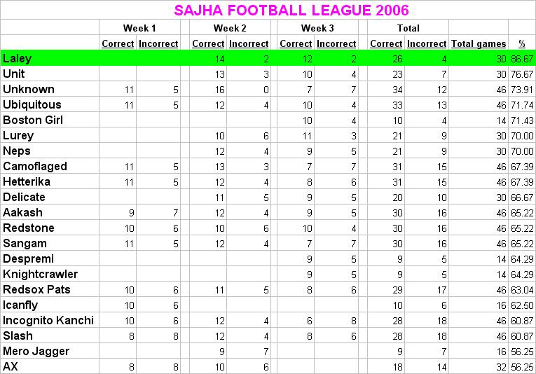 Here's the score after week 3. Laley is the winner. However, Unit is not far behind. A small request guys. When u post your predictions, i would appreciate if you use the City's name rather than using some thing else. For eg, instead of using Green Bay at Detroit --------->>>> CHEESSEHEADS>>>> please just use Greenbay at Detroit --------->> Green Bay. makes my life a little easier.