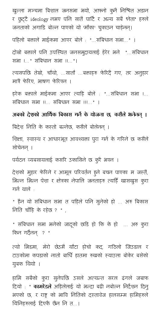 Bold Decision of SPA हा हा हा हा …… नेपथ्यबाट यौटा आबाज आयो : "तुरुन्तै संबिधान सभाको निर्बाचनको घोषणा गरेस नत्र… ! …" हाम्रा देशका महान नेता र भावी प्र. म. ले "त्वं शरणम्" गर्दै तुरुन्तै बिन्ति बिसाए " ख्वामित ! हजुरकै ईसारा मै त सबै कुरा गर्दै छु नि …" उताबाट फेरि commanding voice मा आबाज आयो "… संसदको पहिलो बैठकमै राखेस नि फेरि…" । यताबाट नरम गिडगिडाहट निस्क्यो " श्री ६ सरकार ! हजुरले भन्नु भन्दा पहिले नै सेवकहरुले यो "हाम्रै माग हो" भनेर घोषणा गरि सकेका छौ ……, आदेस आउनु पूर्ब नै बोलेकोमा क्षमा पाँउ ……" "…अनि के हो ? , पछाडी त अझै 'लोकतन्त्र जिन्दाबाद' भनेको जस्तो सुनिन्छ नि… " नेपथ्य बाट पून नोकर हप्काई आयो । "हैन मार्ग दर्शक! …हैन मालिक!!, 'गणतन्त्र जिन्दाबाद' नै भन्दैछन, फोनमा आबाज राम्रो नआएको होला " "२-३ महिना यत्तिक्कै दूर-निर्देशन कै भरमा चलाउन सक्छौ हैन त ?" उताबाट शंका मिस्रित प्रश्न आयो । " हजुर नआउन्जेल जेन तेन धानिहाल्छु नि … । राम जंगल जांदा भरतले खडाउकै भरमा त चलाएका थिए … अहिले त फोन, मोबाईल सबै छ … छलफल नगरेको बिषयमा बोल्न परिआएमा सेवकले हजुरमा जाहेर गरिहाल्छ नी …" फोन राखेर नेताजिले कोठामा बसेका बाँकि ६ जनालाई हेर्दै भने " मालिकलाई छिट्टै यता ल्याउने प्रबन्ध गरौं है … यो का. मु. चलाउनु भन्दा सेवामा समर्पित भै कारिन्दा को काम गरौं … सजिलो पनि हुन्छ, धर्म पनि! " "हस !" सबैले एकै चोटि सहमति जनाए । मिटिङ सक्कियो र नेताहरुले बाहिर गई पत्रकारहरुलाई बैठकको निर्णय सुनाए : " हामिले आज जनताको माग अनुशार निक्कै Bold Decision लिएका छौं ……, संसदको पहिलो बैठकमै संबिधान सभाको कुरा उठाउँने छौं "