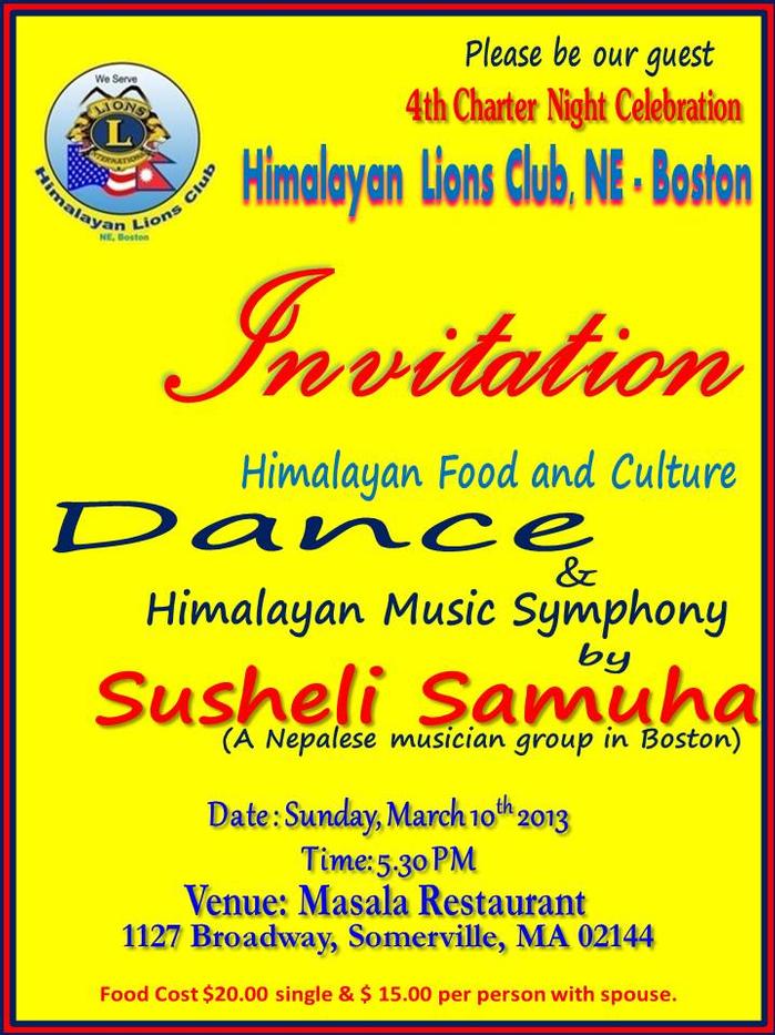 Himalayan Lions Club NE (Boston) is celebrating 4th charter night on Sunday 10th March 2013. The night will be with Lions district dignitaries and all the club members with their families and friends. Also we would like to invite all the other community organizations executive board and members as well.