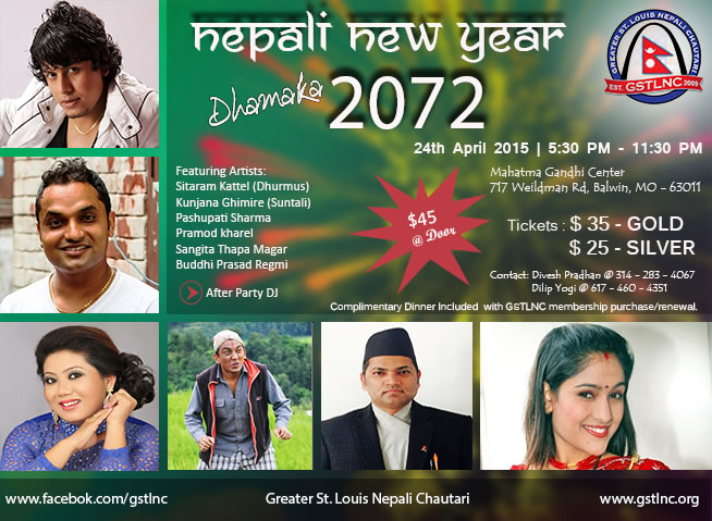 Greater St. Louis Nepali Chautari (GSTLNC) presents Nepali New Year Dhamaka 2072 on Friday April 24th 2015 @ Mahatama Gandhi Center.