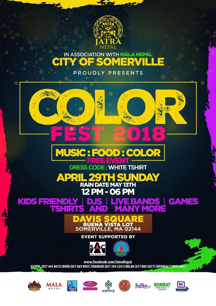 Boston, Mother Nature rained, literally, on our plans to paint the skies in hues of our celebration last year, despite rescheduling three times. And we, like all of you, were so disappointed.So to make up for that, we are absolutely thrilled to deliver our promise of bringing the most colorful festival the skies of Boston has seen: COLOR FEST 2018: a celebration of color, groovy music and the most delicious Nepali food. While the colors will wash off, the good times you’ll have had will leave their imprint on you for a lasting time! Come listen to some of the most talented Nepali artists, dance to the beats of the best DJ in town and enjoy delicacies from Nepal while you experiment what colors look good on you and your loved ones.This is an event you don't want to miss out on. You can either take our word on it or regret not being there while you browse through pictures of your friends having the time of their lives.